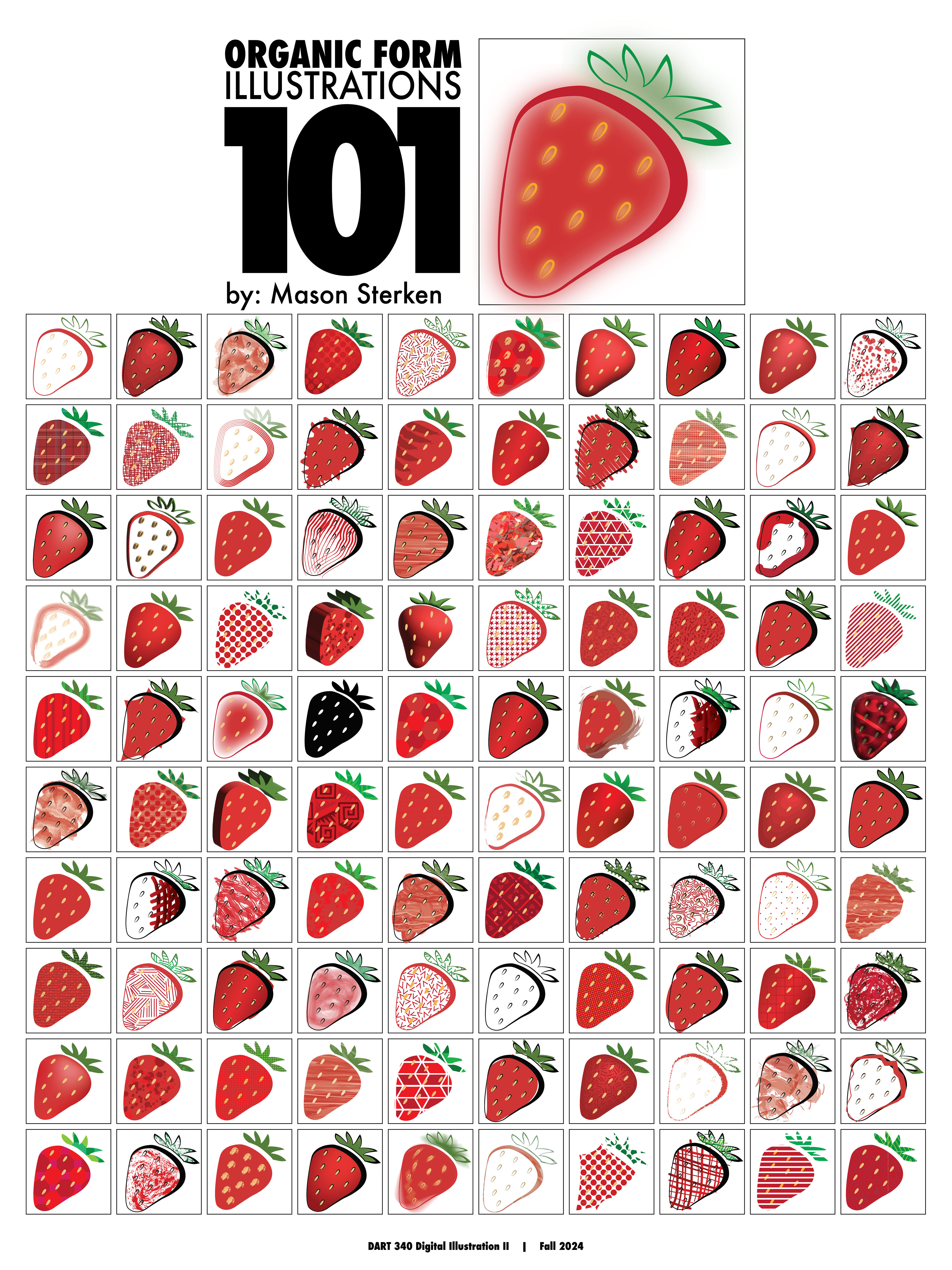 This project was created to help build on our understanding and skills in Adobe Illustrator. We were tasked to create an illustration of an organic form, then replicate it 101 different ways. These used a combination of patterns, shapes, brushes, shadows, textures, and effects to create the same simple design in 101 unique ways.